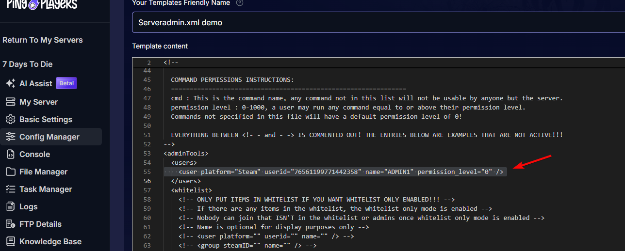 <user platform="Steam" userid="PLAYERID" name="ADMIN1" permission_level="0" />- Then, replace PLAYERID with the SteamID of the player you want to give admin.