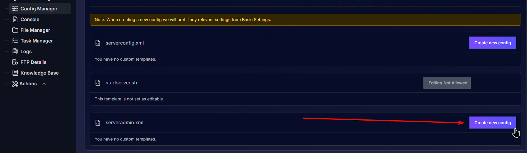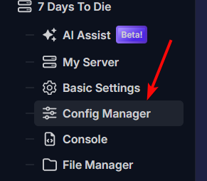 In the management area, look for the "Config Manager" option. Click on it; it'll show the different config files for your server, if you're not familiar with it, you may check our Config Manager guide .