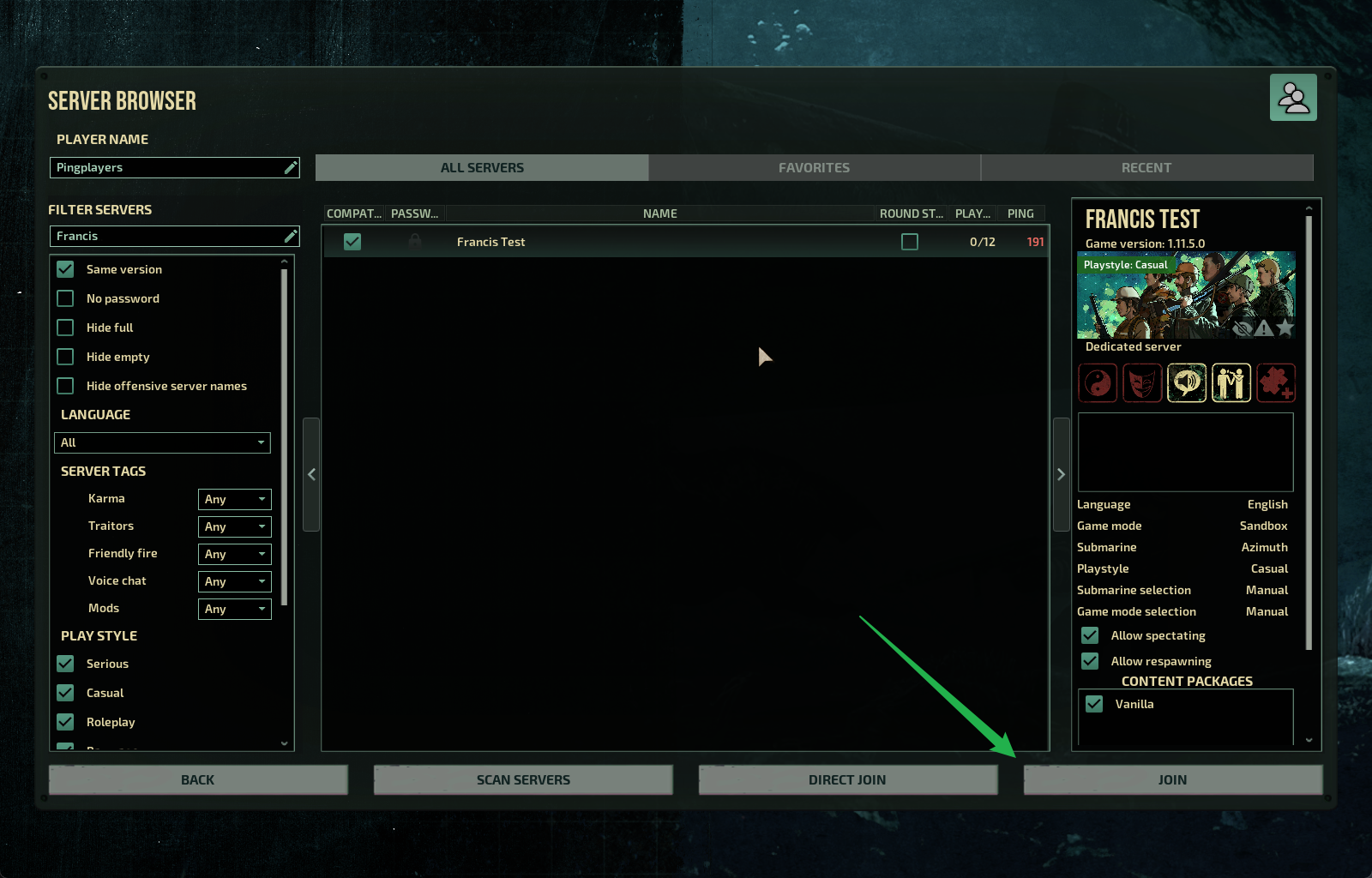 Your crew is now ready to dive! Whether you use the public browser or the direct connection method, you should be able to load into your submarine without a hitch.