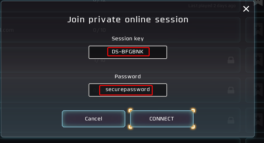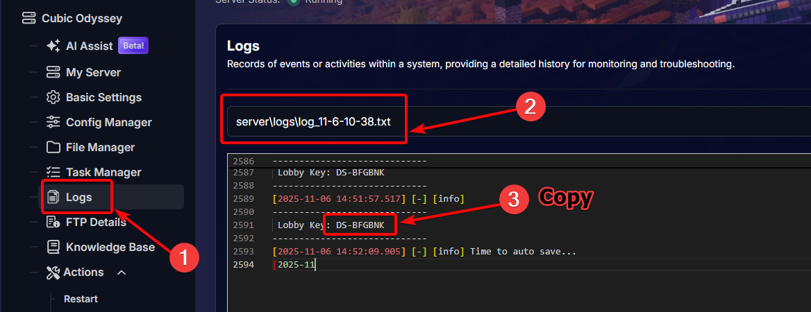 You can also connect using the Lobby Key, which is displayed in the server logs. Follow these steps: