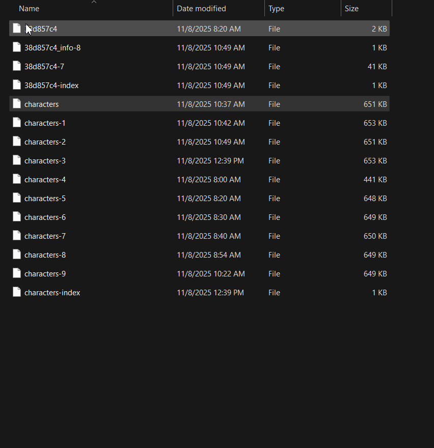 _infofile is its description and then the-indexfile for the autosaves which is also considered as the game's backup save). The save file will also include thecharacter-save that we recommend taking note as well.[some_hex_string](e.g.,38d857c4)[some_hex_string]_info(e.g.,38d857c4_info)[some_hex_string]-indexor[some_hex_string]-(number)(e.g.,38d857c4-7 or38d857c4-index)