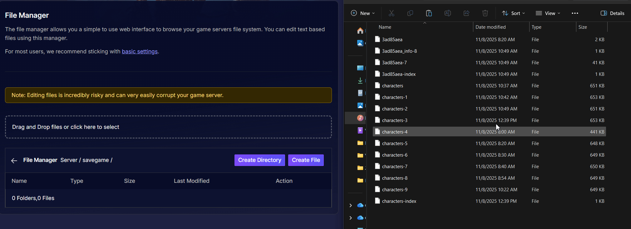 charactersfile and overwrite the server's file. - Restart your server by going to Actions>Restart.