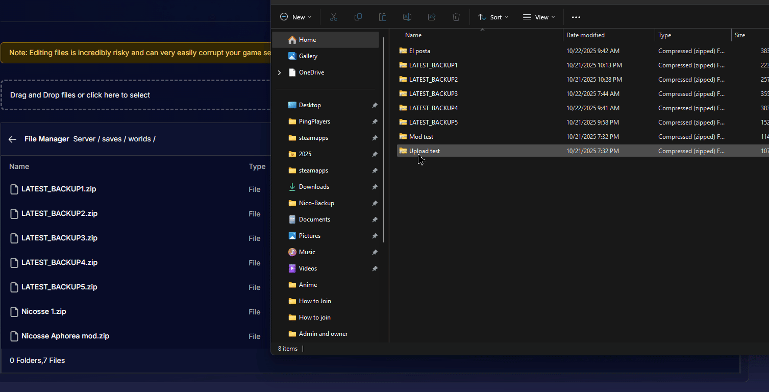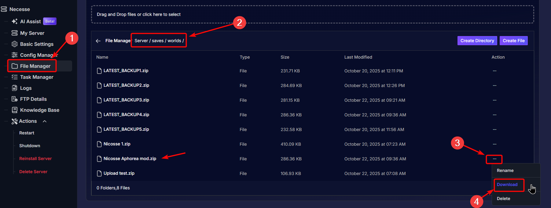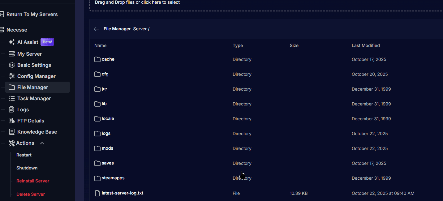 Managing your Necesse server files is crucial for maintaining your game data. You can manage these files through either the File Manager or FTP. The File Manager is conveniently available from the left side panel of our website, and it's user-friendly, providing features to download, upload, rename, create, move, and delete files or folders.