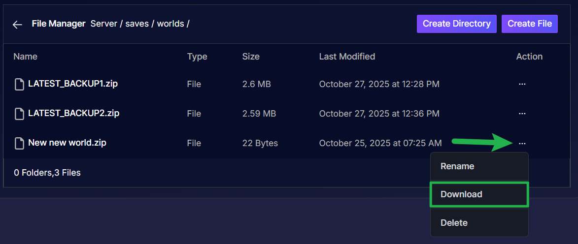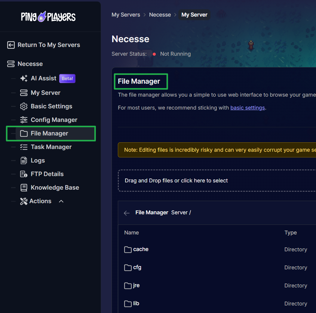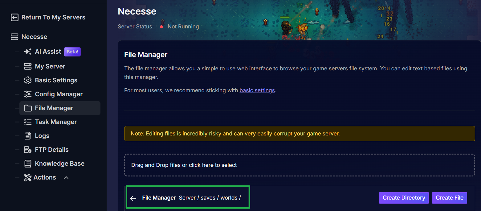 Before you modify any server files, it is crucial to shut down your server. Go to Actions > Shutdown in your control panel. Modifying, downloading, or uploading files while the server is running can corrupt your world and break your game.