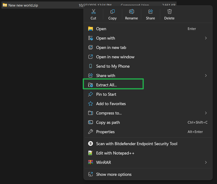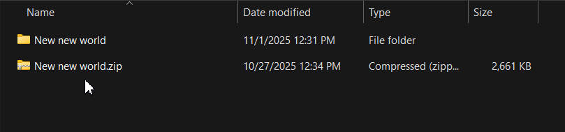 .zipfile you just downloaded (e.g.,world.zip). - Unzip this file using Windows or a tool like 7-Zip. This will create a new folder with the same name (e.g.,