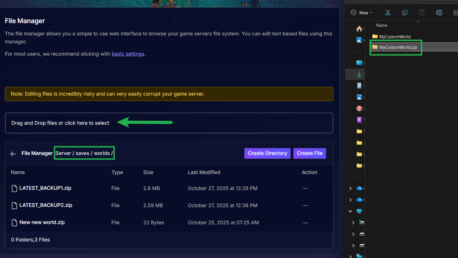 /Server/saves/worlds/directory and upload your newMyCustomWorld.zipfile there.