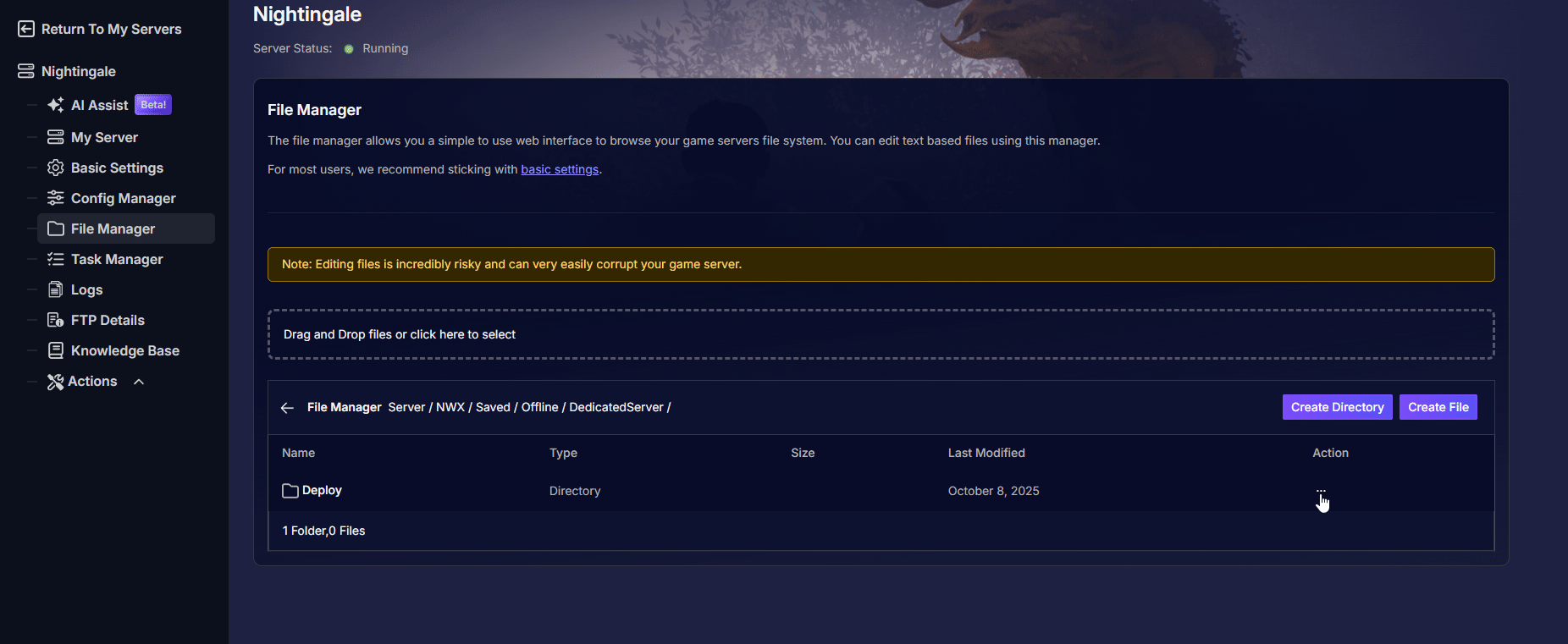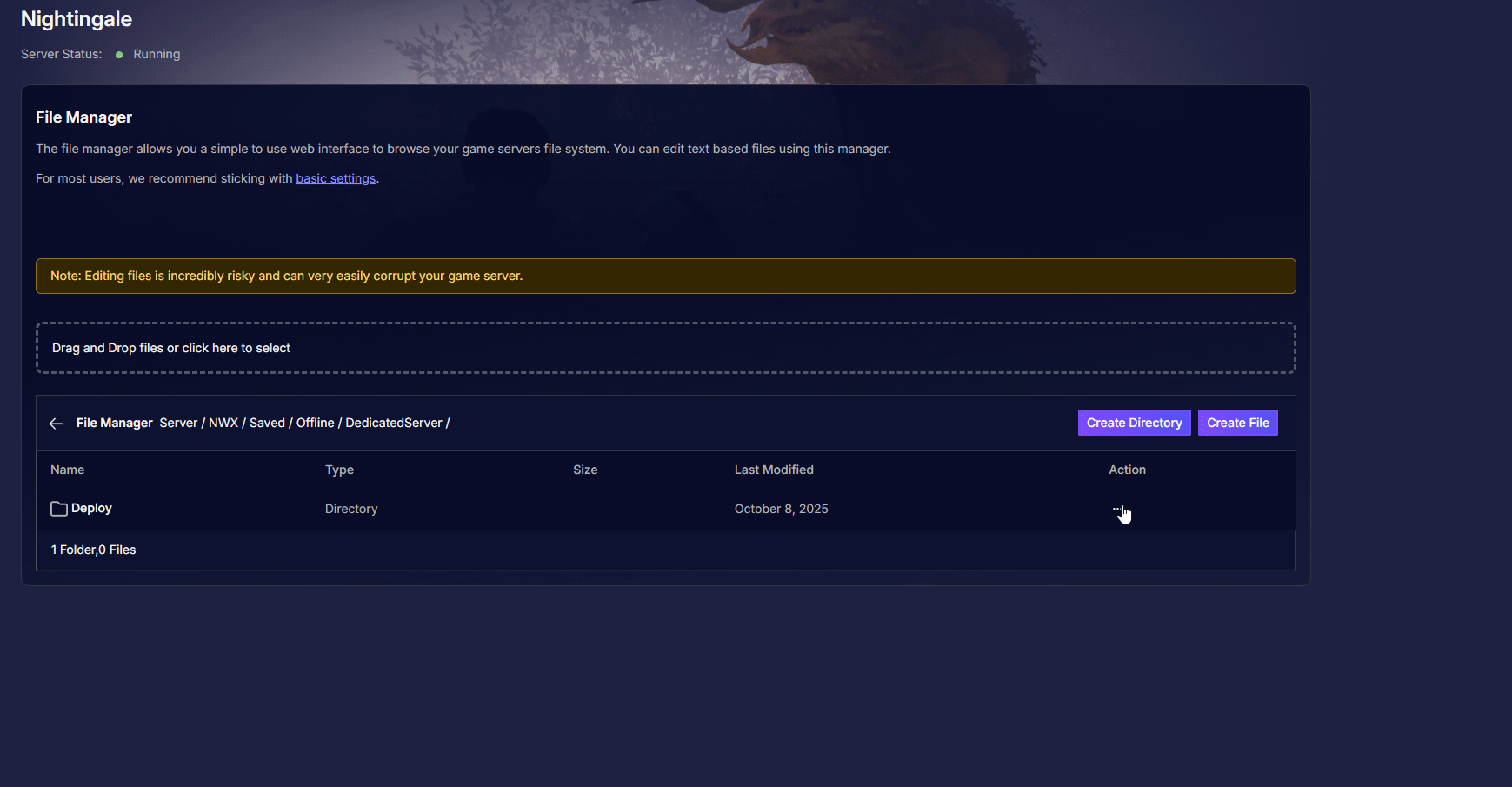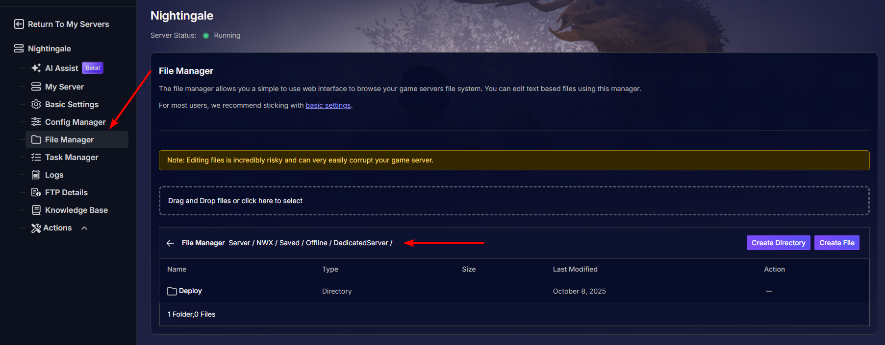 - Deletion of files will fail if the server is still turned on; make sure to shut down your server before making any important modifications.