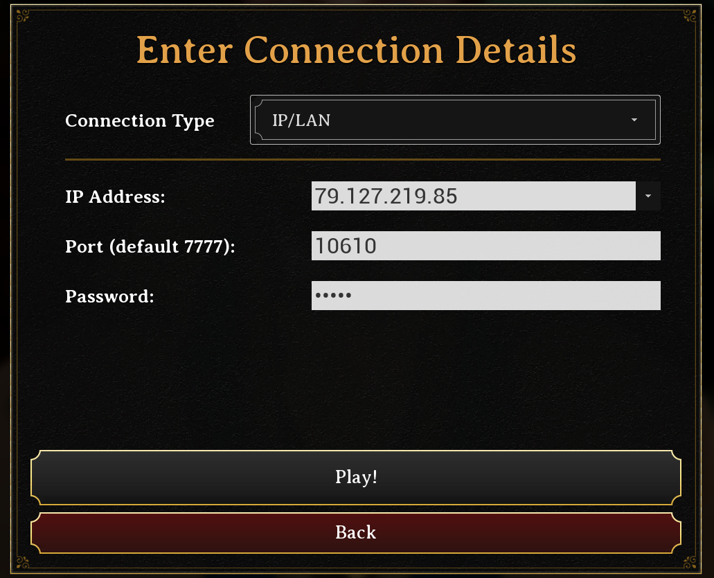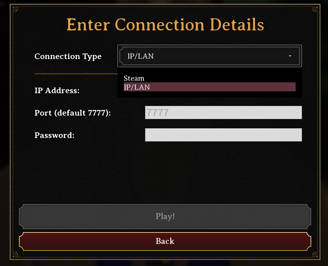 Once selected, click Join a game and select IP/LAN in the Connection Type dropdown menu.