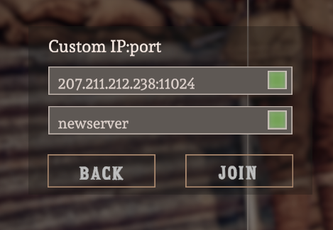 If the server browser does not show your server (troubleshooting, mostly), or you prefer to connect directly, use the Custom IP or Direct Connect option and enter your Server IP:Port.
