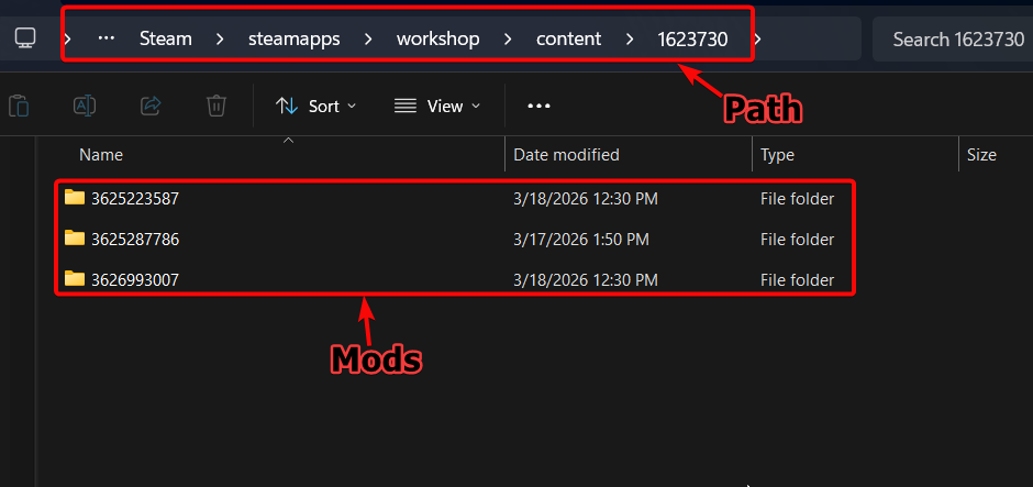 D:orE:), the path will start there instead ofC:. Search your installation drive for thesteamapps\\workshop\\content\\1623730folder. Don't get mixed with the game directory “Mods” folder, that one is missing files (usuallyC:\Program Files (x86)\Steam\steamapps\common\Palworld/Mods)