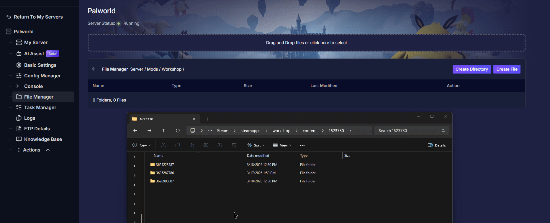 Before you begin, if you are currently running a standard Palworld server, you must first recreate your server and choose the "Palworld Moddeable" branch. The standard branch does not support this functionality, at least for now.