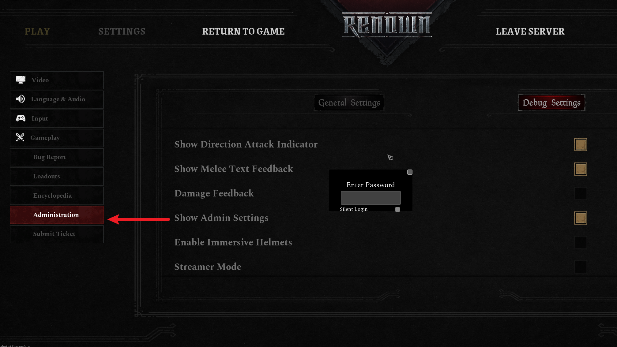 Once enabled, you should see an Administrators option on the left panel. Click on it and insert your admin password. This will grant you access to the admin menu in-game.