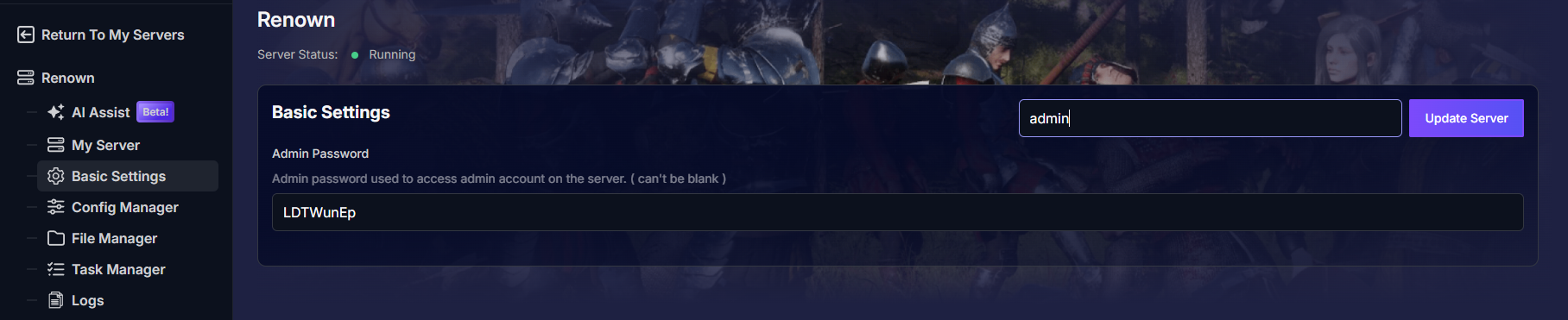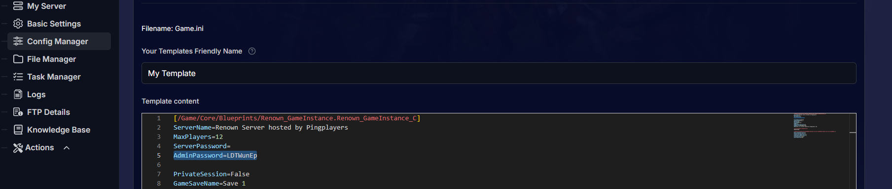 Take note of your Admin Password: You can find this either in your Basic Settings or in the Game.ini config template (if you've created one).
