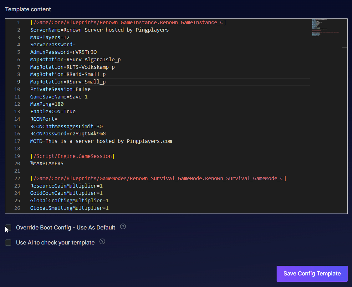 Game.inifile has the "Override Boot Config - Use as Default" box checked. If it's not checked, the server is ignoring the file. - Check for Typos: A single wrong character will break the entry.