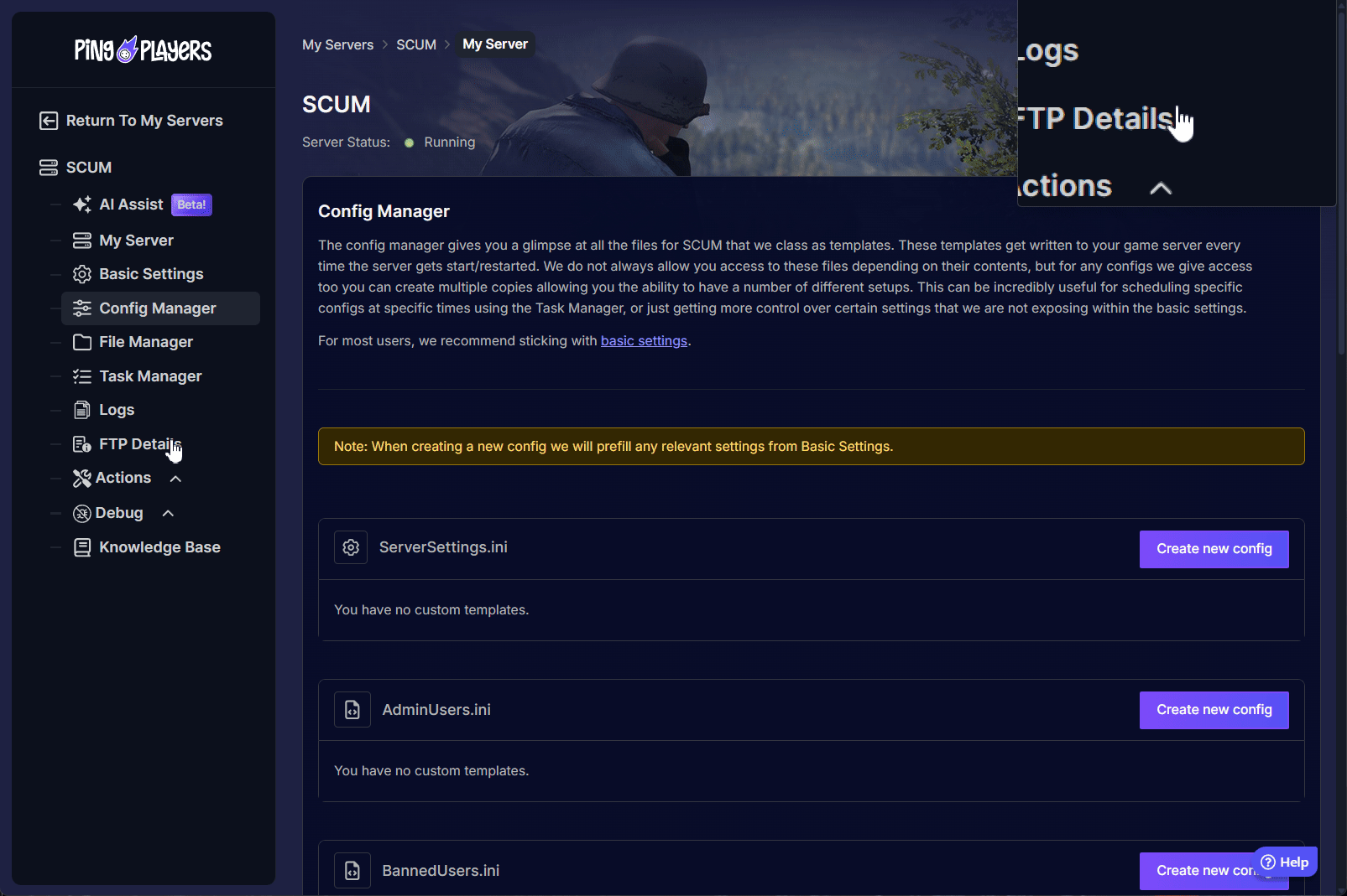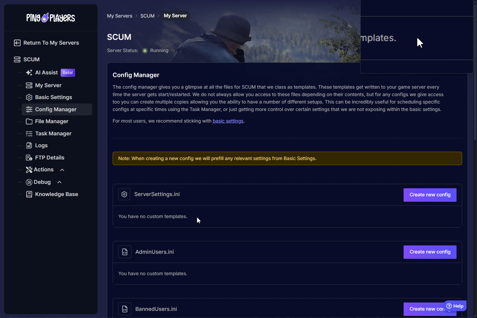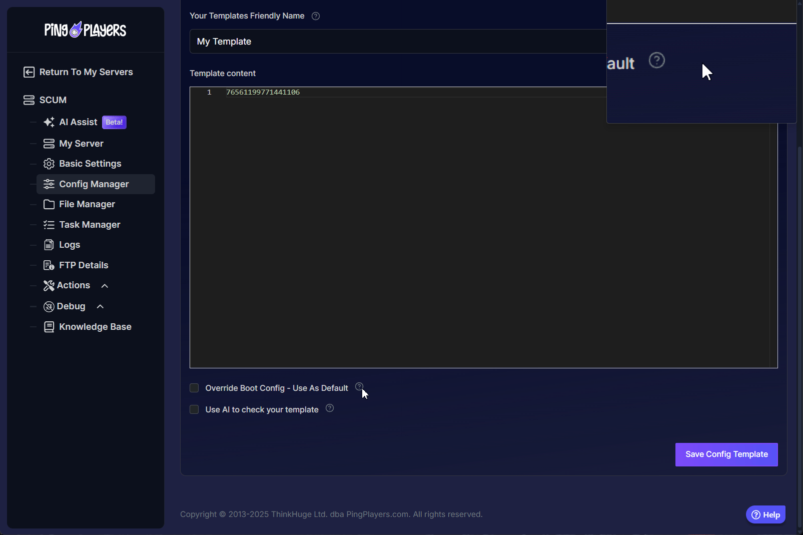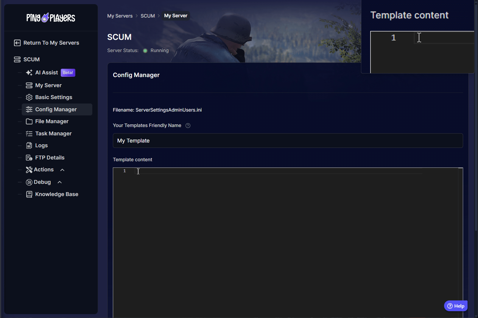 - Open your server configuration, click on the Config Manager option on the left panel and create a template for