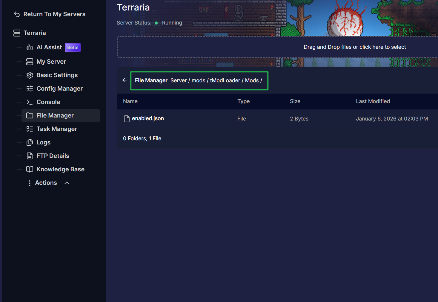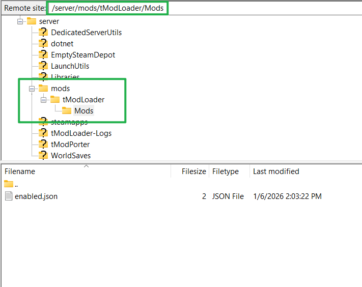 /Server/Mods/tModLoader/Modsfolder and upload your.tmodfiles there.