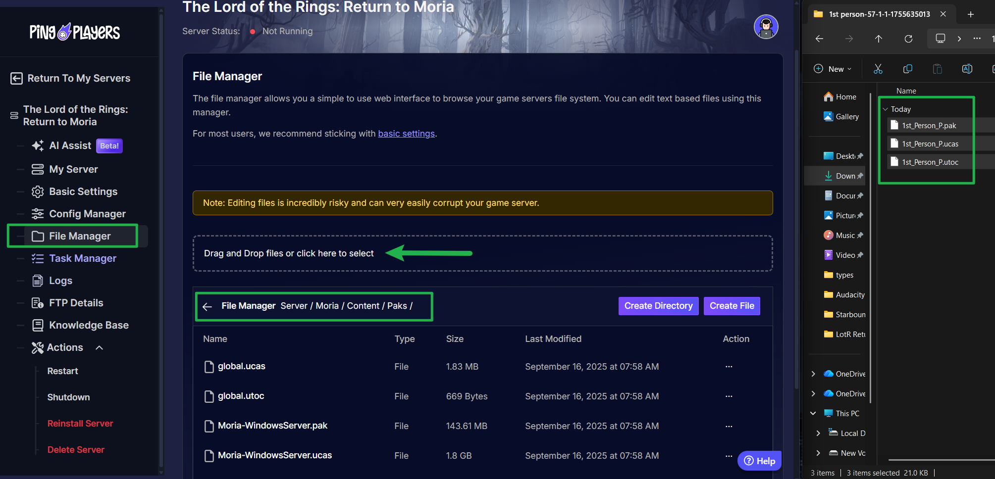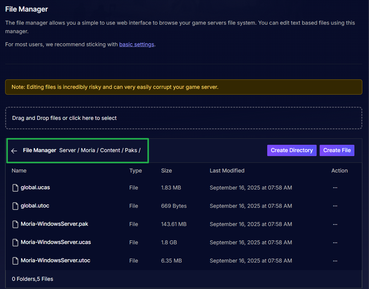 .pakFile(s): Upload the.pakmod file(s) you extracted in Part 1 directly into thisPaksfolder.