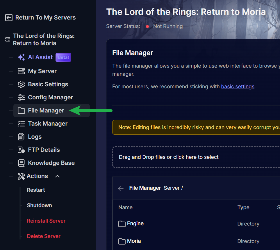 You must shut down your server (via Actions > Shutdown) to prevent corrupting your realm. You can upload the necessary files using the File Manager or an FTP client. For those who might be unfamiliar with FTP, you can refer to our detailed guide on Connecting through FTP. This can provide you with all the necessary steps for first-time usage.
