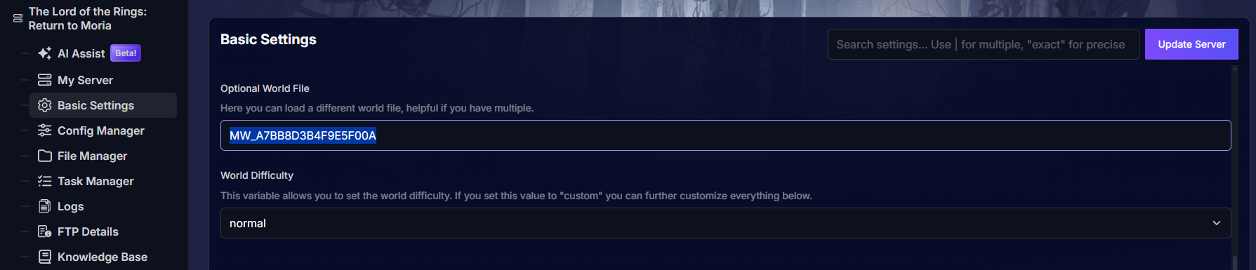 Now, copy the name of the save file that has a “.sav” (without the .sav extension) and insert it in the Optional World File variable under the Basic Settings.