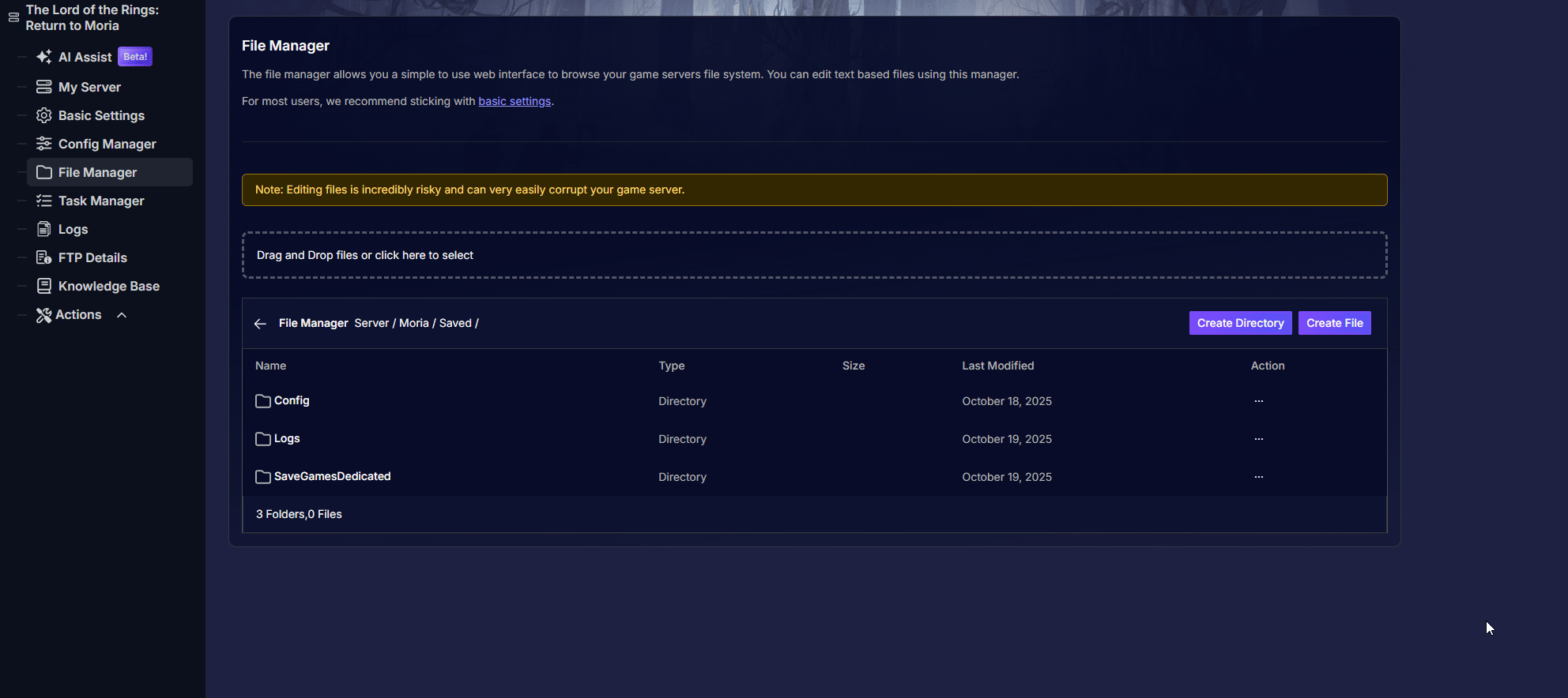 Managing your server files is an essential task for any game server owner. Whether you want to back up your current world or migrate from another server, it's easy to manage server files through the File Manager or FTP.