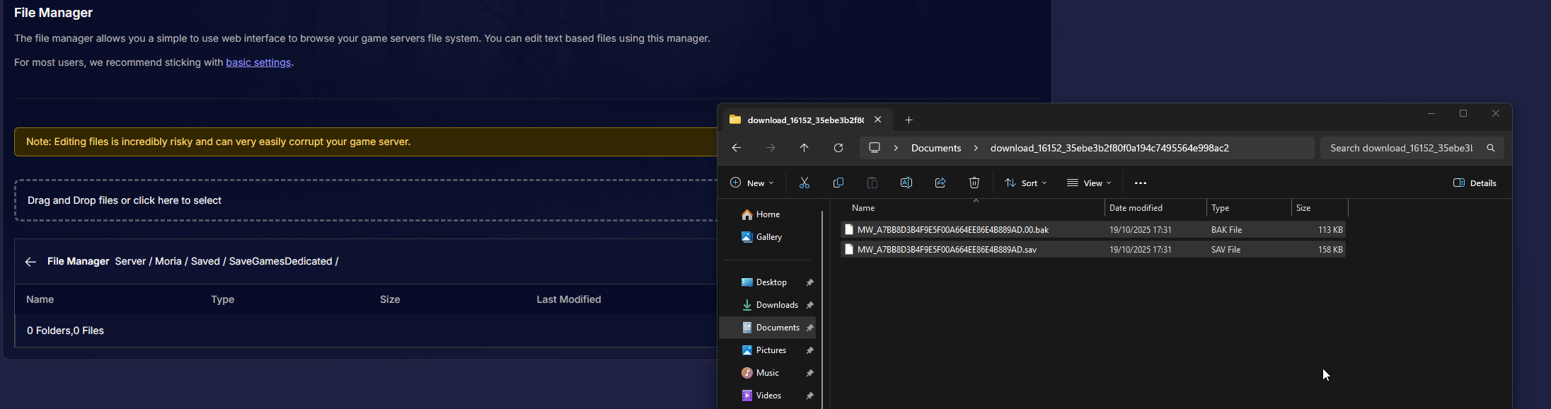 MW_, and use File Manager or FTP to upload them into the server's/Server/Moria/Saved/SaveGamesDedicated/folder.